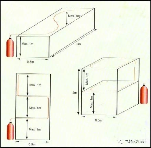 對(duì)于全淹沒(méi)應(yīng)用方式,允許有不大于總內(nèi)表面積的1%的開(kāi)口;局部應(yīng)用方式,對(duì)于直接式探火管滅火裝置,允許有不大于總內(nèi)表面積的5%的開(kāi)口。