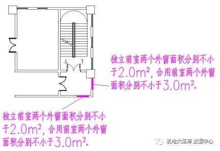 2)設(shè)有兩個及以上不同朝向的可開啟外窗,且獨(dú)立前室兩個外窗面積分別不小于2.0m2 ,合用前室兩個外窗面積分別不小于3.0m2。