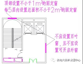 靠外墻的防煙樓梯間,尚應(yīng)在其外墻上每5層內(nèi)設(shè)置總面積不小于2 m2的固定窗。