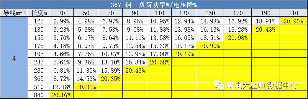 現(xiàn)根據(jù)DC36V配電系統(tǒng)的技術(shù)參數(shù),按電壓降不高于20%進(jìn)行整理。