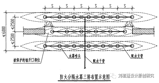 《噴規(guī)》7.1.16規(guī)定防火分隔水幕的噴頭布置,應保證水幕的寬度不小于6m,采用水幕噴頭時,噴頭不應少于3排(見下圖);采用開式灑水噴頭時,噴頭不應少于2排。而中庭連廊,是人員疏散通道,窄的連廊,僅僅為3、4米寬,人員在水幕下疏散相當危險。